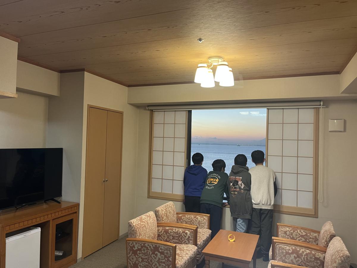 「ゆったりたっぷりの〜んびり♪」のホテル三日月に到着しました!ホテルの部屋はオーシャンビュー!沈む夕陽が見れました。陽は落ちても6年生の気持ちは急上昇です!