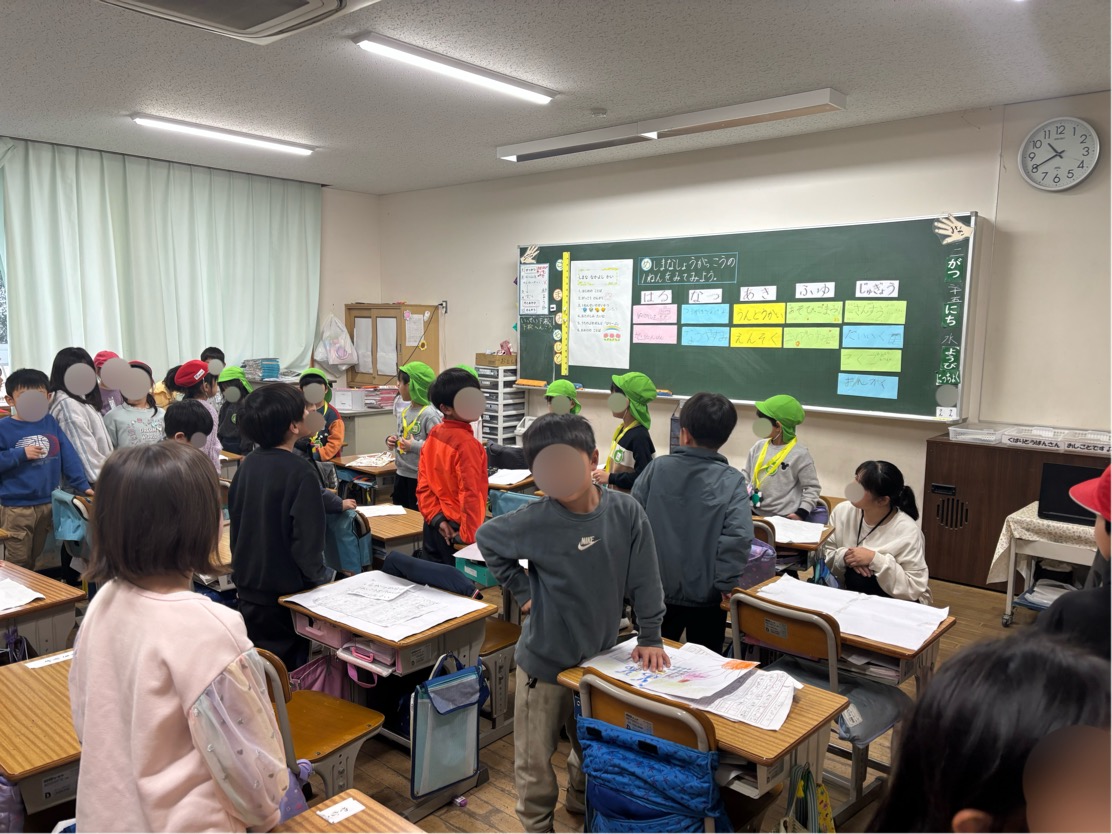 今週は保育園・幼稚園から、年長さんのお友達が1年生の教室に遊びに来ました。初めて教室に入る年長さんと、お兄さんお姉さんの立場になる1年生、お互いドキドキでした。