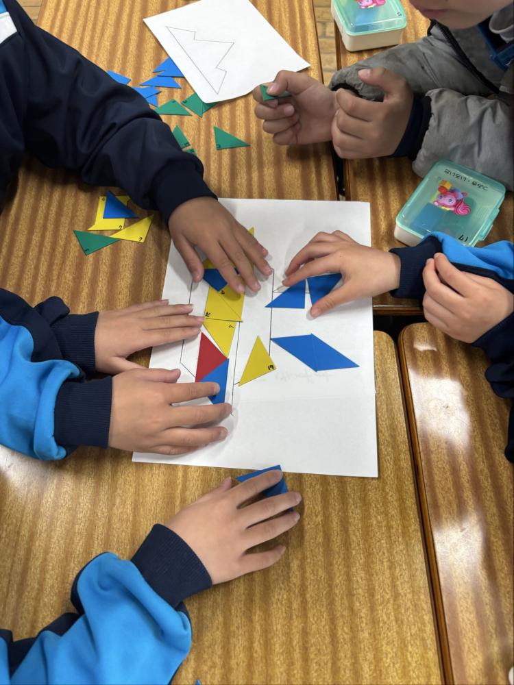 1年生の算数「かたちづくり」では、三角形の色板を使い、様々な形を作る学習をしています。最初はペアで簡単な形を、次はグループで少し難しい形を作ってみました。お題の紙を渡すと「えーなにこれ!」「三角でどうやってこれを作るの?」と子どもたちはざわざわしましたが、上手に話し合いながらみんなで協力をし、大作が完成!中には「そんな方法があったのか」と教える側もびっくりしてしまうような発想をしているグループも。子どもたちのひらめきには毎日驚かされてばかりです。