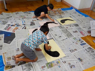覗いてみますと、画用紙の上に墨汁をたらし、1年生が墨汁をたたいて、飛び散らせていました。