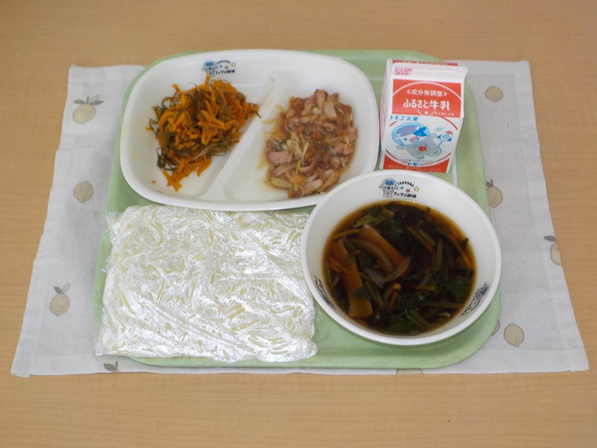 献立は、郡山ブラックラーメン(ソフト中華麺)、牛乳、ネギチャーシュー、いか人参 です。