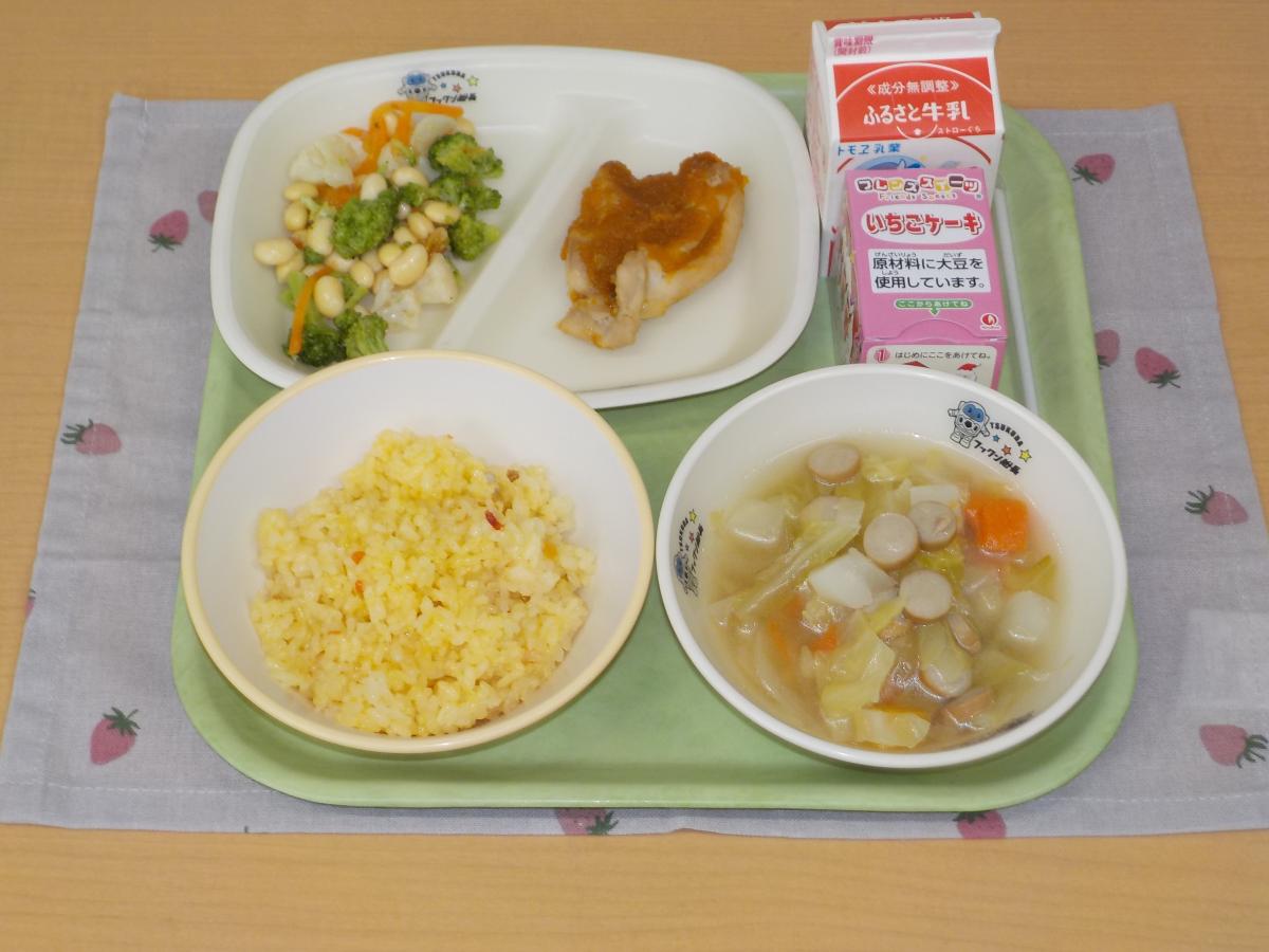 今日の給食では、鶏肉のキャロットソースやクリスマスケーキが出ました。子どもたちは、とてもおいしそうに食べていました。