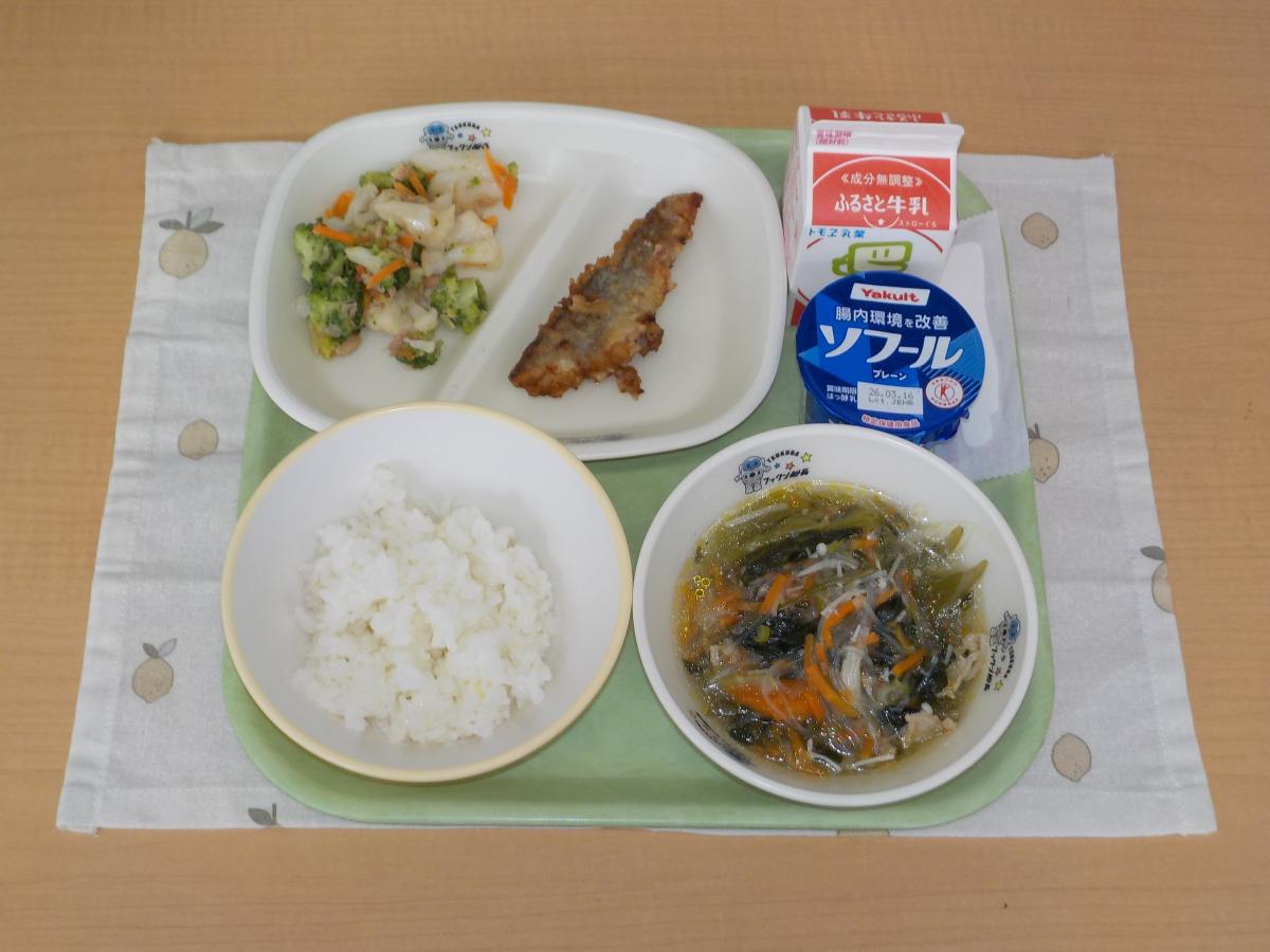 今日の献立は、ごはん、牛乳、たらの米粉揚げ、花野菜サラダ(塩中華ドレッシング)、茎わかめの中華スープ、ヨーグルト です。