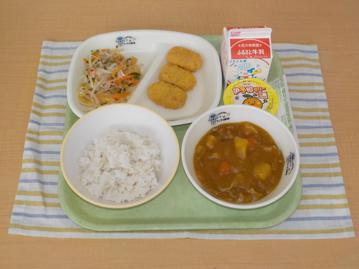 今日の献立は、ポークカレーライス(むぎごはん)、牛乳、チキンナゲット、オーシャンサラダ、いよかんゼリー です。