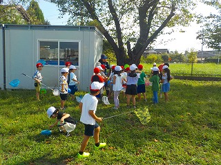 子どもたちは、バッタやチョウの仲間など、いろいろな虫を捕まえて、大切そうに虫かごに入れていました。