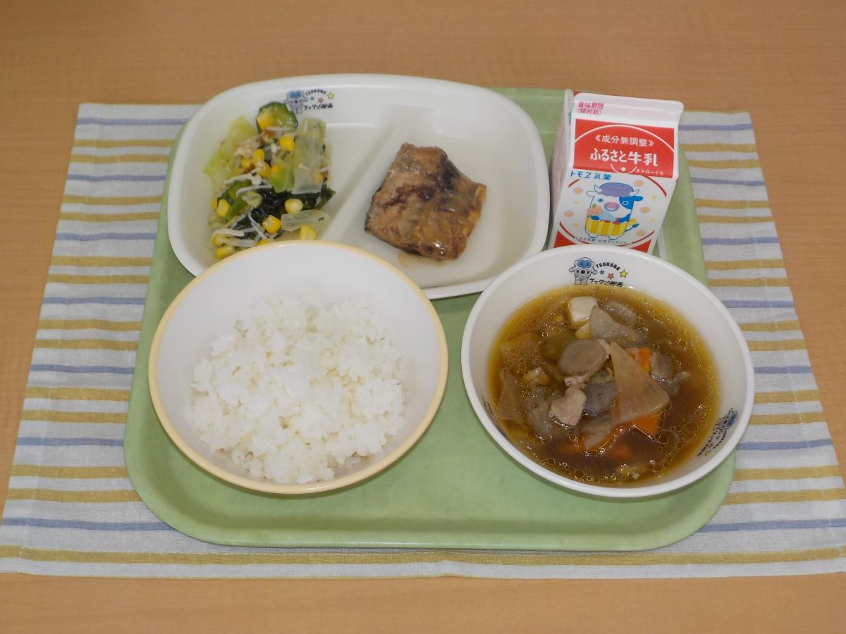 献立は、ごはん、牛乳、さばのみそ煮、五色和え(玉ねぎドレッシング)、とりごぼう汁 です。