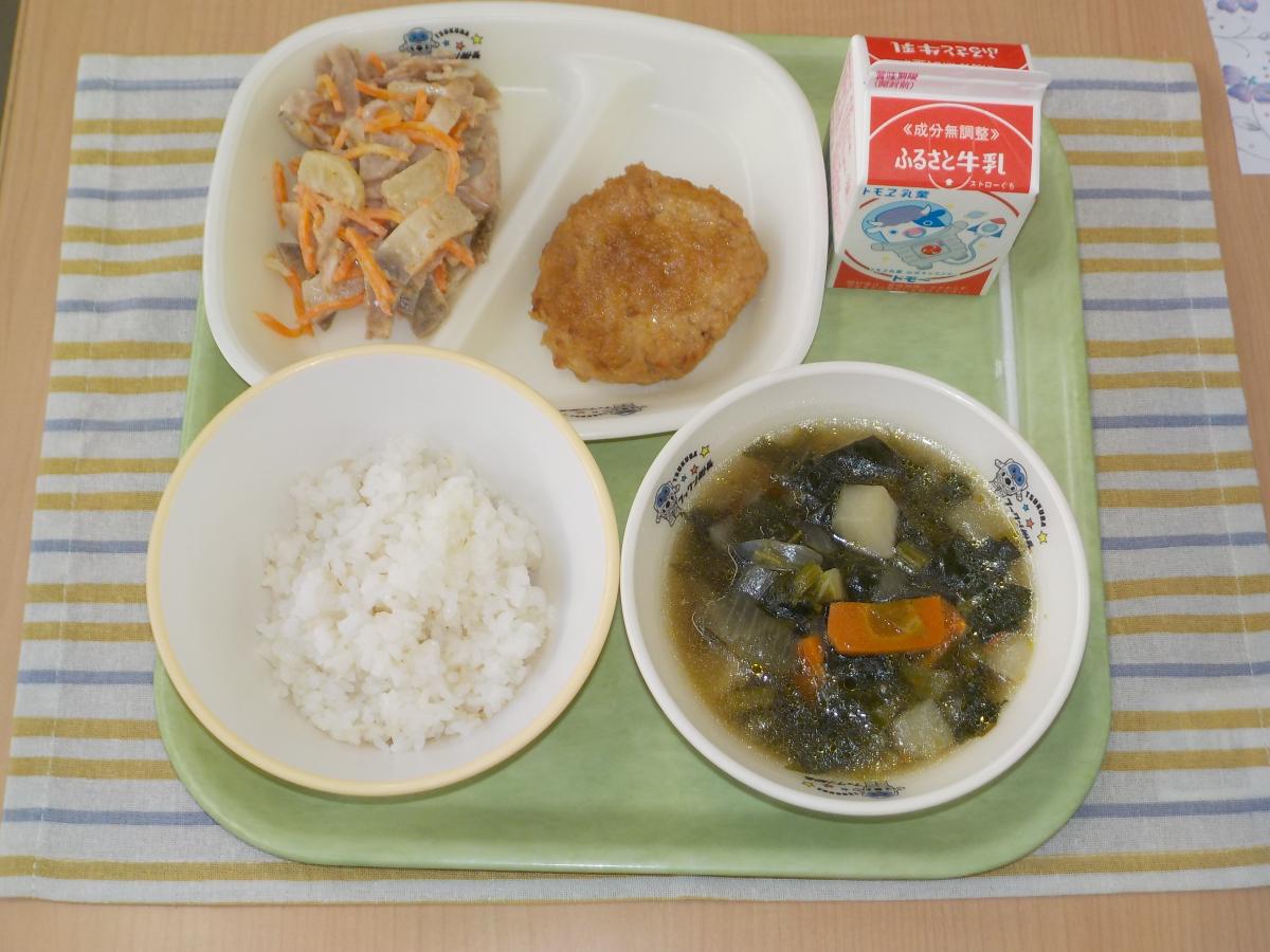 献立は、麦ごはん、牛乳、ハンバーグおろしソース、れんこんとヤーコンのサラダ(和風クリーミードレッシング)、有機野菜のスープ です。