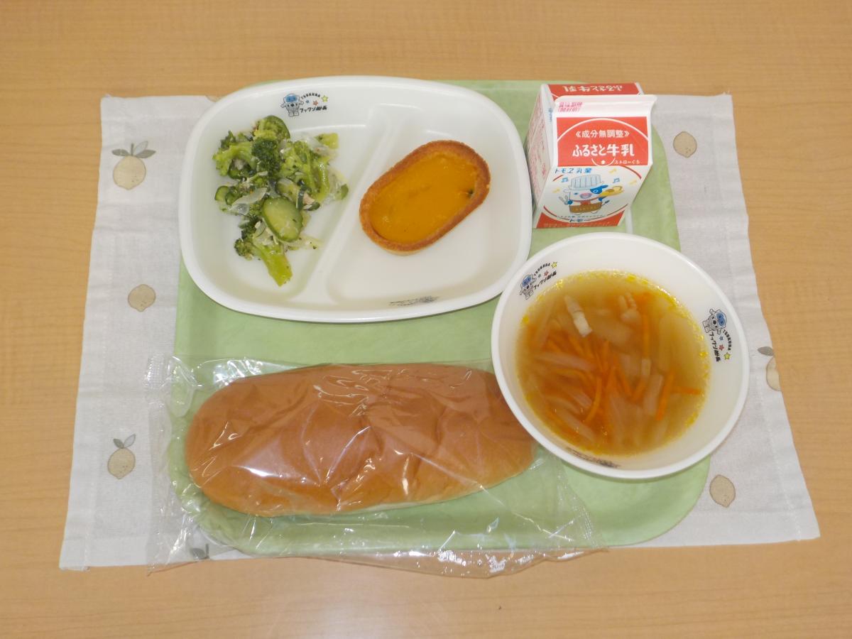 今日の献立は、はちみつパン、牛乳、かぼちゃの豆乳グラタン、チキンマリネ(イタリアンドレッシング)、オニオンスープ です。