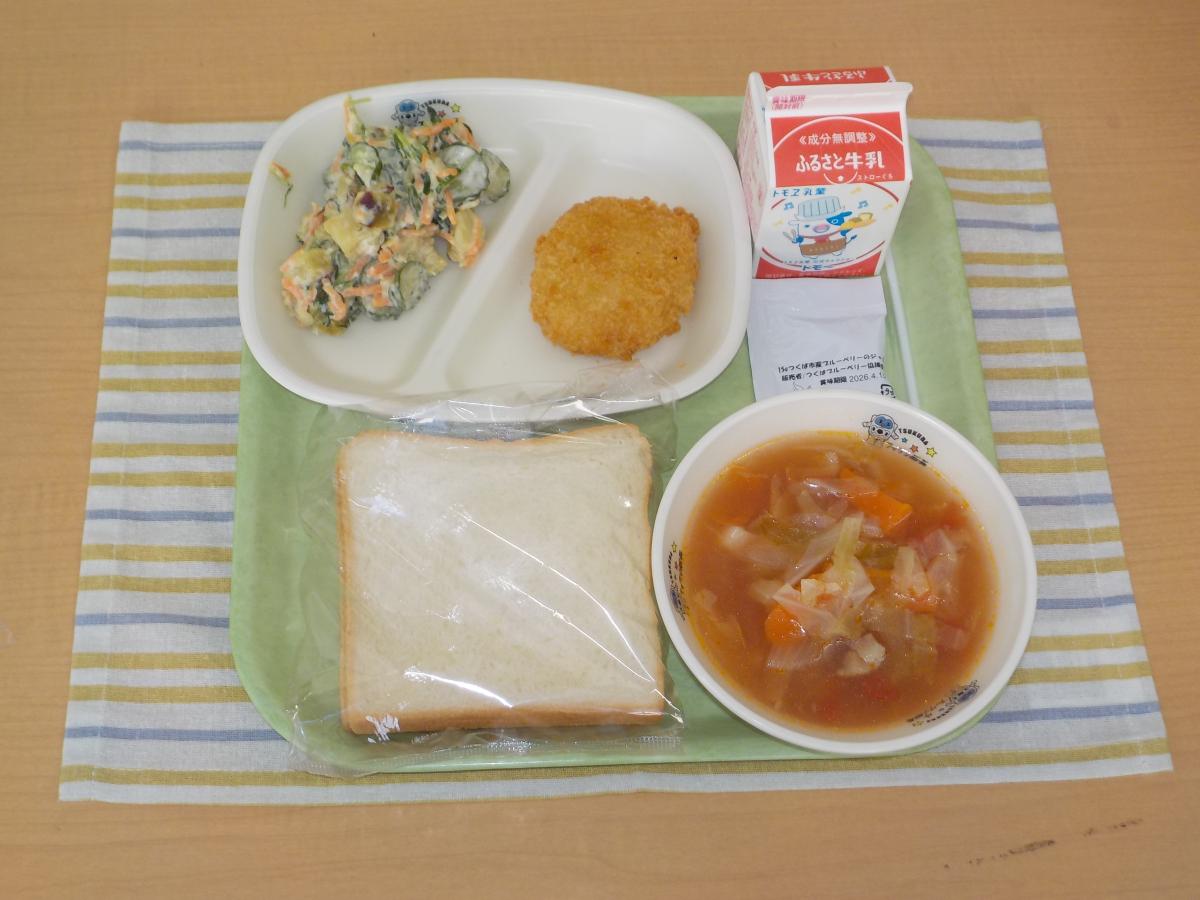 献立は、食パン、つくば市産ブルーベリージャム、牛乳、豆乳クリームコロッケ、さつまいもサラダ(ノンエッグマヨネーズ)、ミネストローネ です。