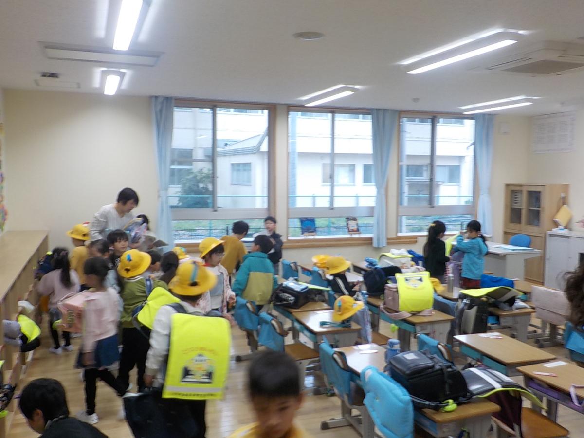 登校初日です。上級生と一緒に、笑顔で登校できました。あいさつをすすんでできる子もたくさんいます。
