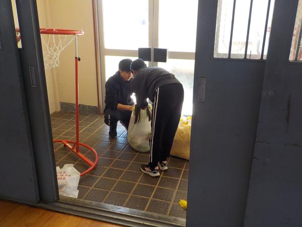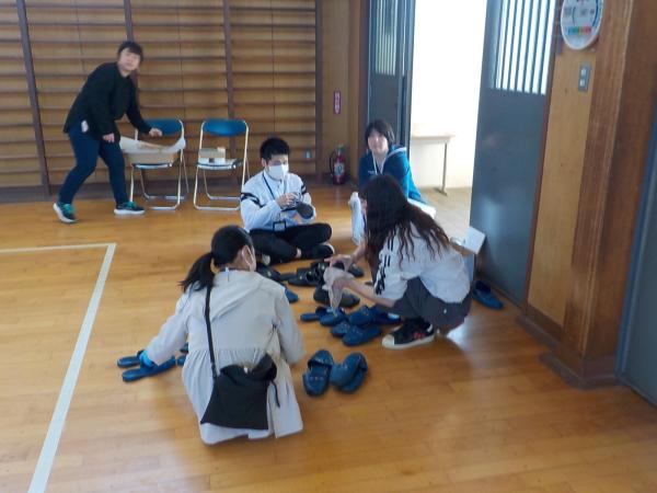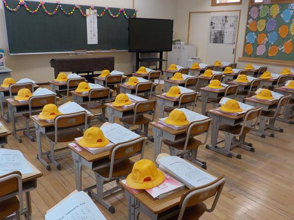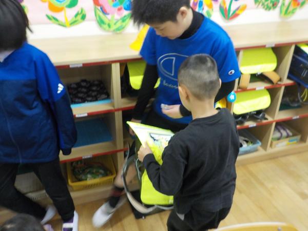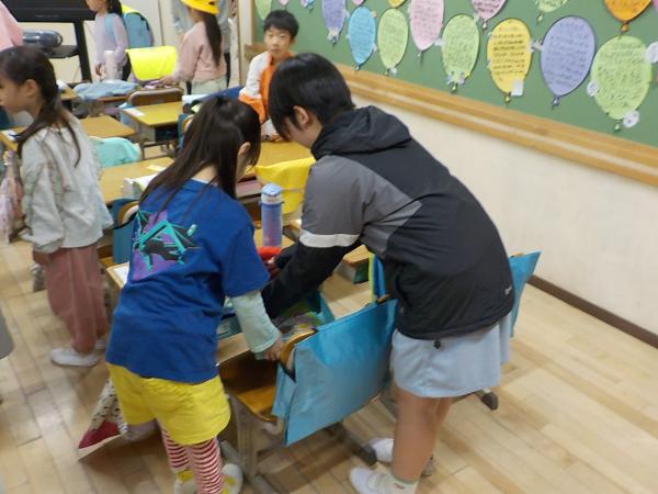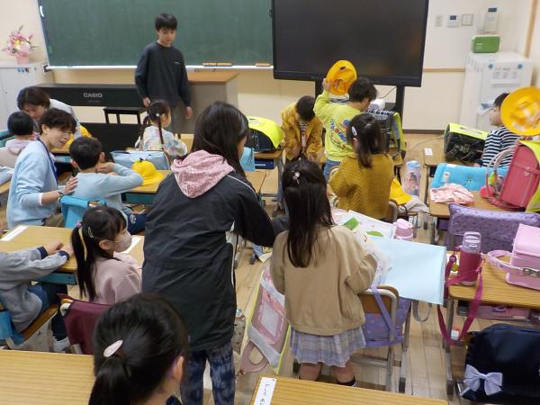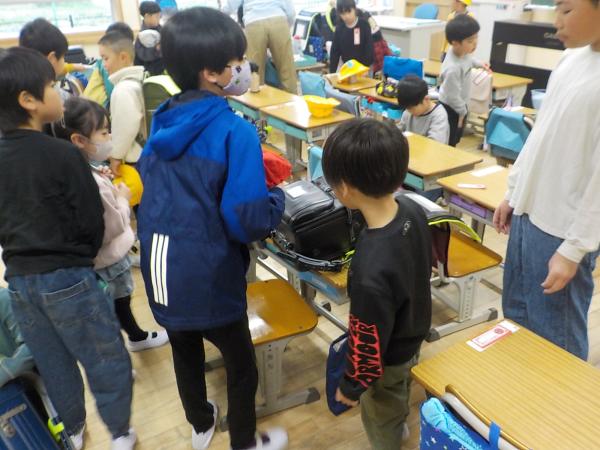 「お手伝いにきました!」と、登校してきた1年生の身の回りのお世話を、6年生が手伝ってくれています。全部やってあげるのではなく、自分でできるように、お手本を見せて、優しく教えてくれています。たのもしい最上級生です。