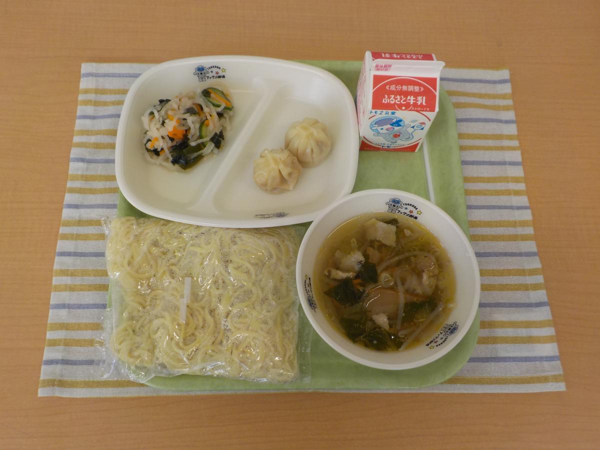 今日の献立は、塩ラーメン(ソフト中華麺)、牛乳、小籠包、わかめの中華サラダ(塩中華ドレッシング) です。