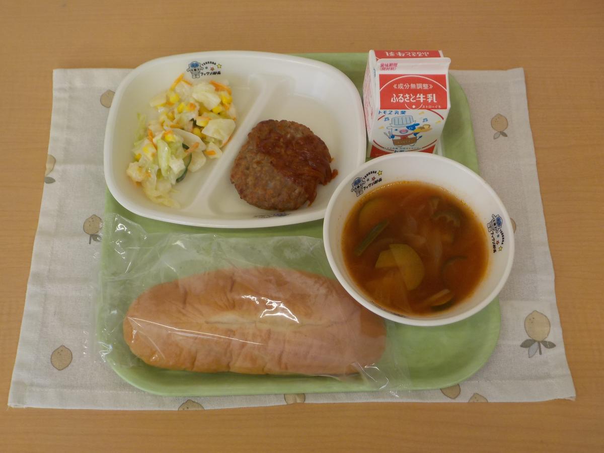 今日の献立は、バターパン、牛乳、ハンバーグデミグラスソース、コールスローサラダ(コールスロードレッシング)、夏野菜のトマトスープ です。