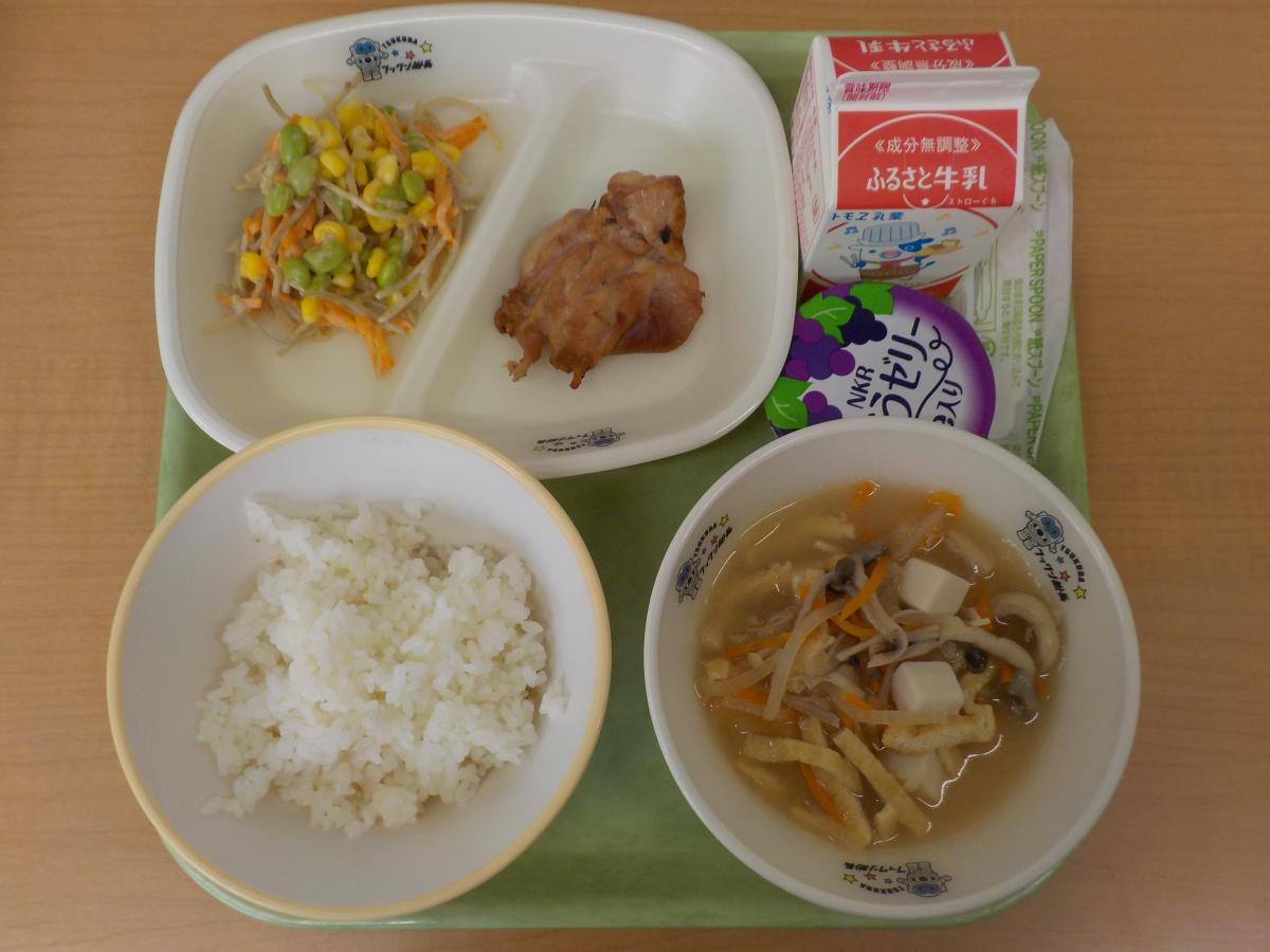 今日の献立は、ごはん、牛乳、鶏肉の七味焼き、ごぼうサラダ(和風クリーミードレッシング)、きのこの味噌汁、ぶどうゼリー です。