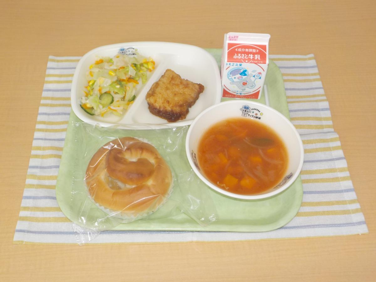 今日の献立は、りんごパン、牛乳、いかのレモン揚げ、コーンと枝豆のサラダ(フレンチ白ドレッシング)、トマトスープ です。