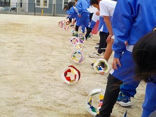 今日は、それをグラウンドに並べて、下敷きで仰いで「かざわ」に風を当て、とても楽しそうに競争していました。