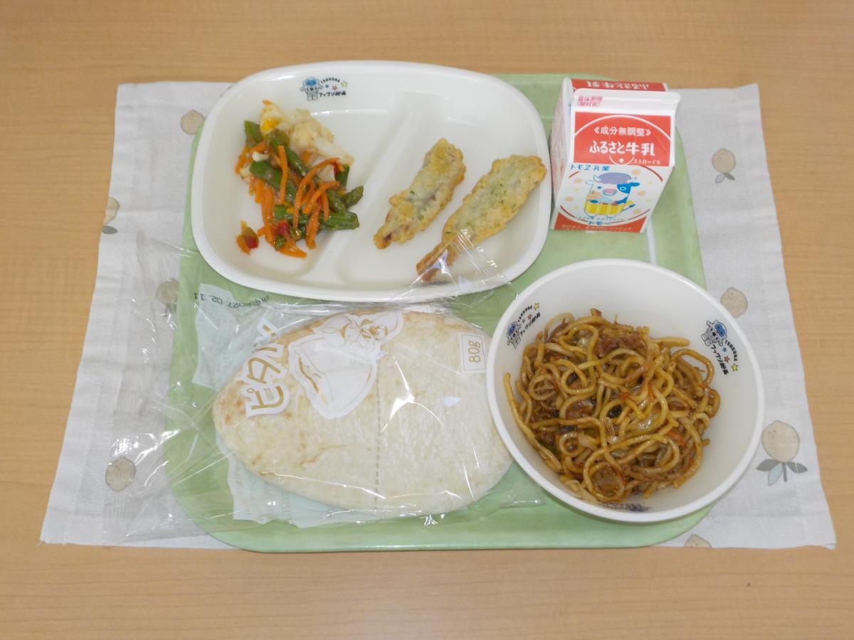 今日の献立は、焼きそば、ピタパン、牛乳、あじフリッター、アスパラガスのカラフルサラダ(減塩和風ドレッシング) です。
