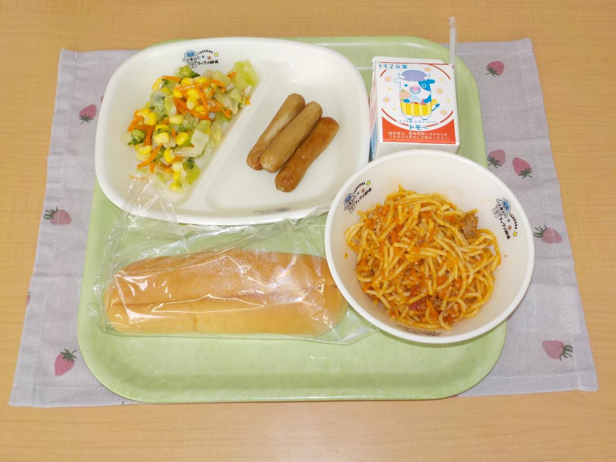 今日の献立は、スパゲッティボロネーゼ、ミニドックパン、牛乳、ウインナー、フレンチサラダ(フレンチ白ドレッシング) です。