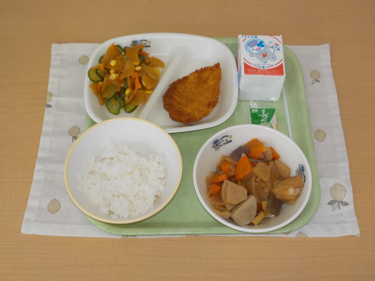 今日の献立は、ごはん、牛乳、チキン南蛮(ノンエッグタルタルソース)、きゅうりのつぼ漬け和え、煮しめ です。