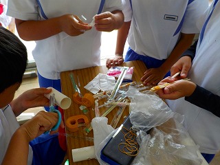 昼休み、ベランダから3年1組をのぞいてみると、数人の子どもたちが集まって工作をしていました。