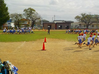 競技の内容は綱引きでした。5年生が2つのチームに分かれ、それぞれのチームの半分の子どもたちがスタートと同時に綱引きを始めます。同時に、それぞれチームの残された半分の子どもたちがグラウンドを半周走ってから、綱引きに加勢する競技のようです。