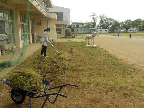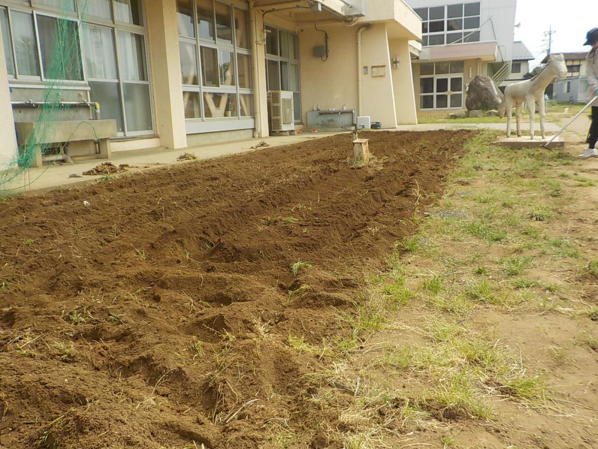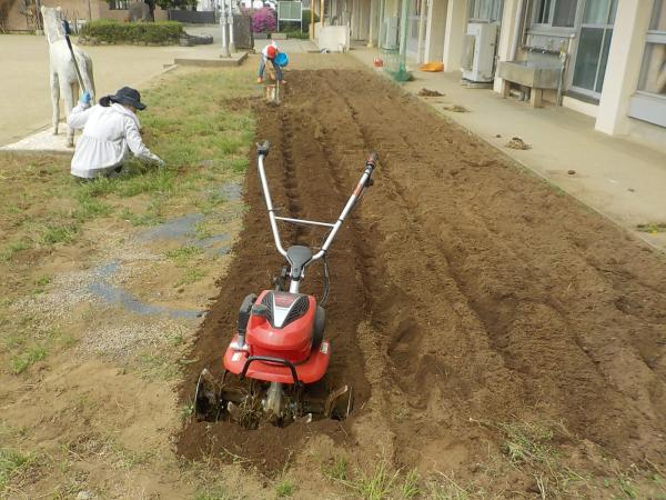 3年生の教室の前の畑を耕しました。ヘチマやヒマワリ、ピーマンなどを植えて、生長観察して学びます。