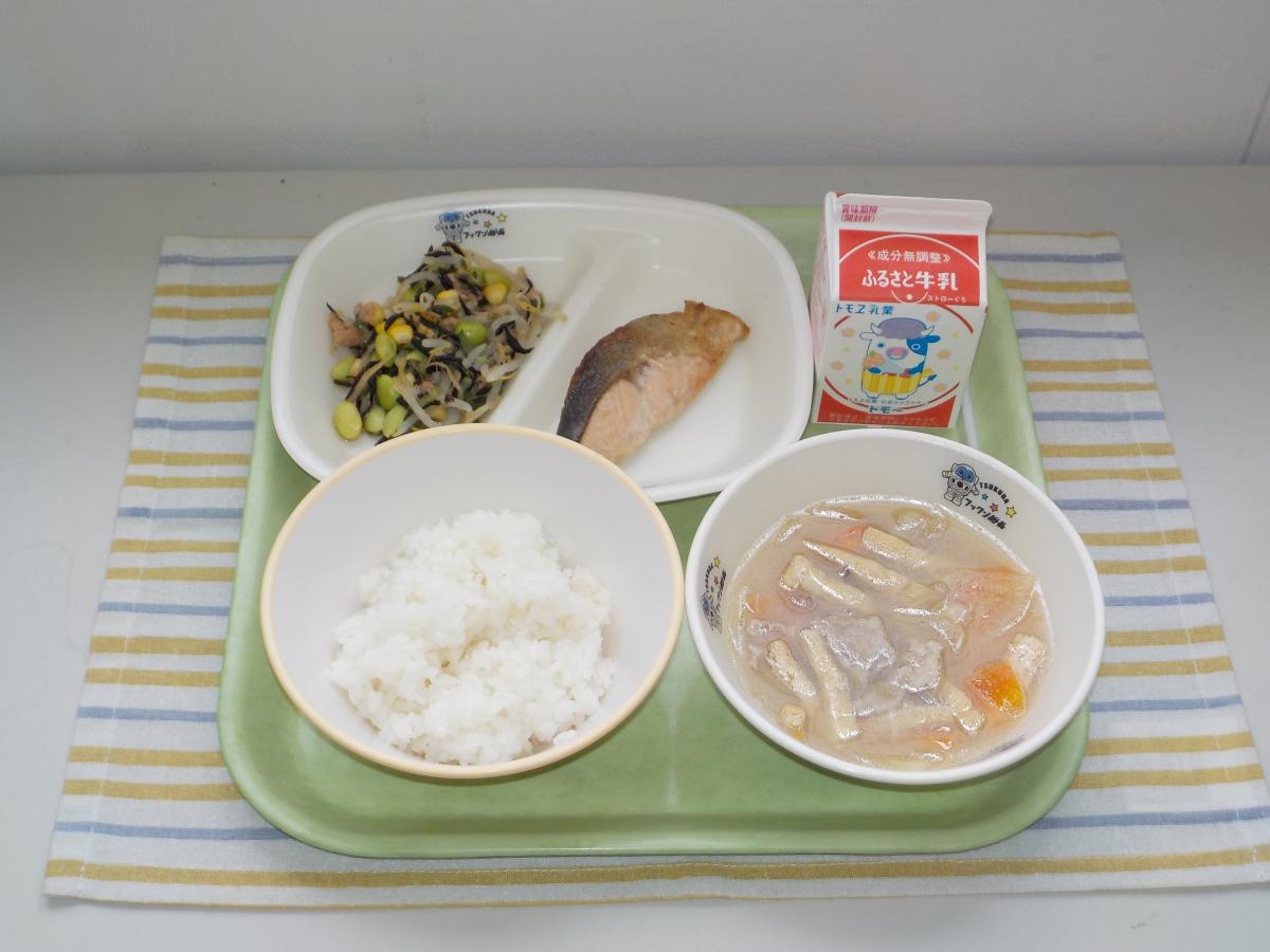 今日の献立は、ごはん、牛乳、鮭のマヨネーズ焼き、ひじきのサラダ(中華ドレッシング)、豚汁 です。