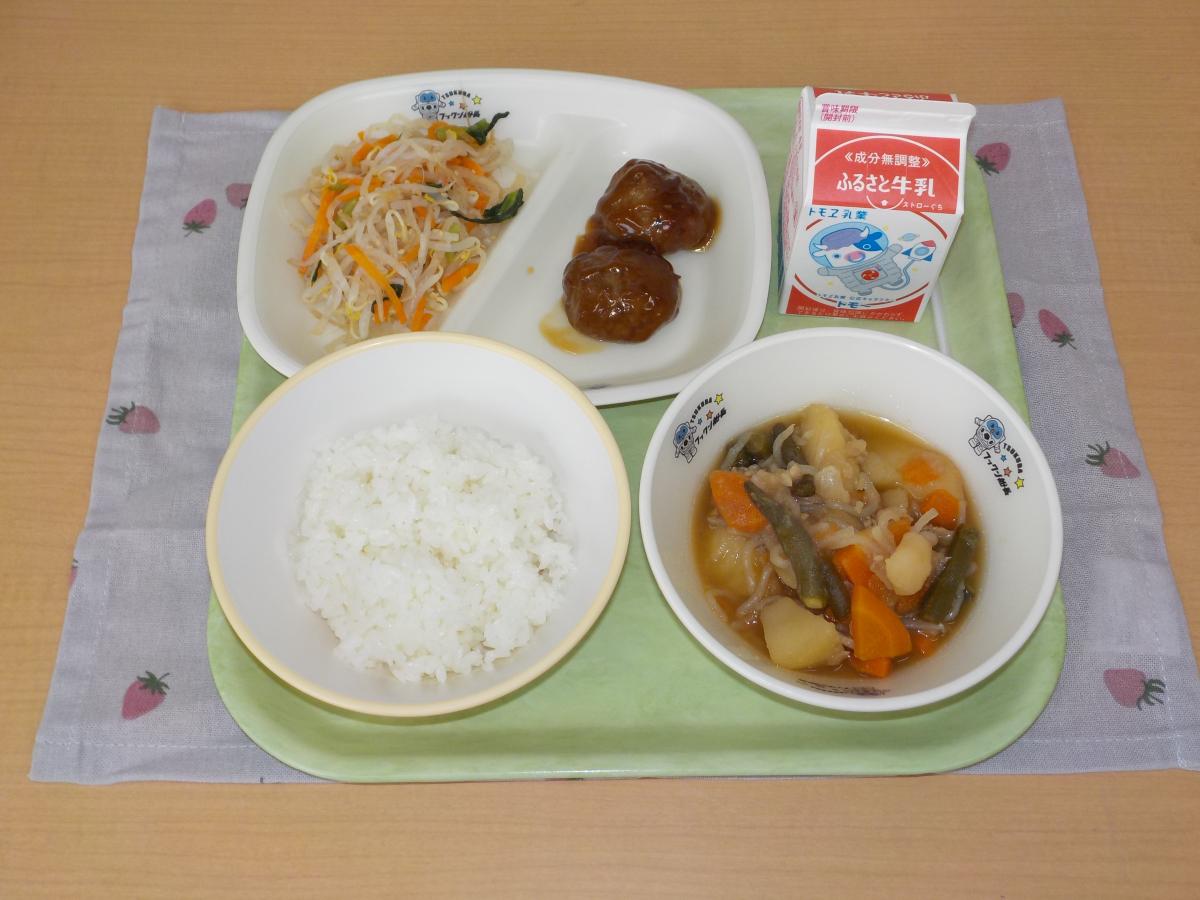 今日の献立は、ごはん、牛乳、照り焼きつくね、たくあん和え、肉じゃが です。