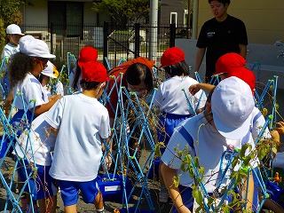 1年生が、夏の間に育てたアサガオの”つる”を使って、クリスマスリースをつくっています。