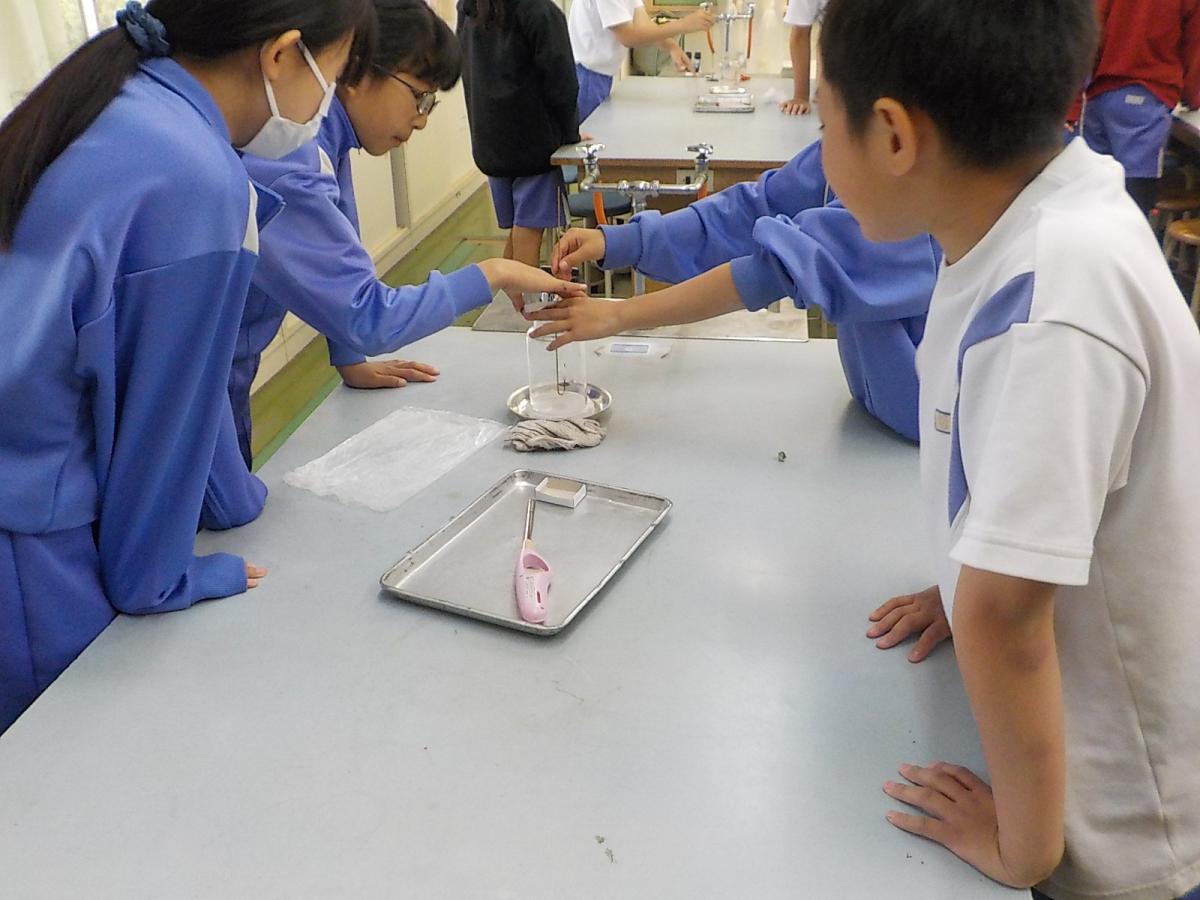集気びんの中に火をつけたろうそくを入れます。どんな条件ならば火が燃え続けるか、予想を立てて実験開始。
