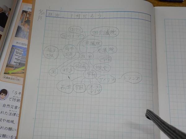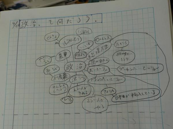 「政治って何だろう」というテーマ。まずは政治と聞いて、どんなイメージを持っているか、マッピングをしてみます。ここから、学習問題を作っていきます。