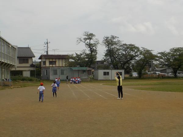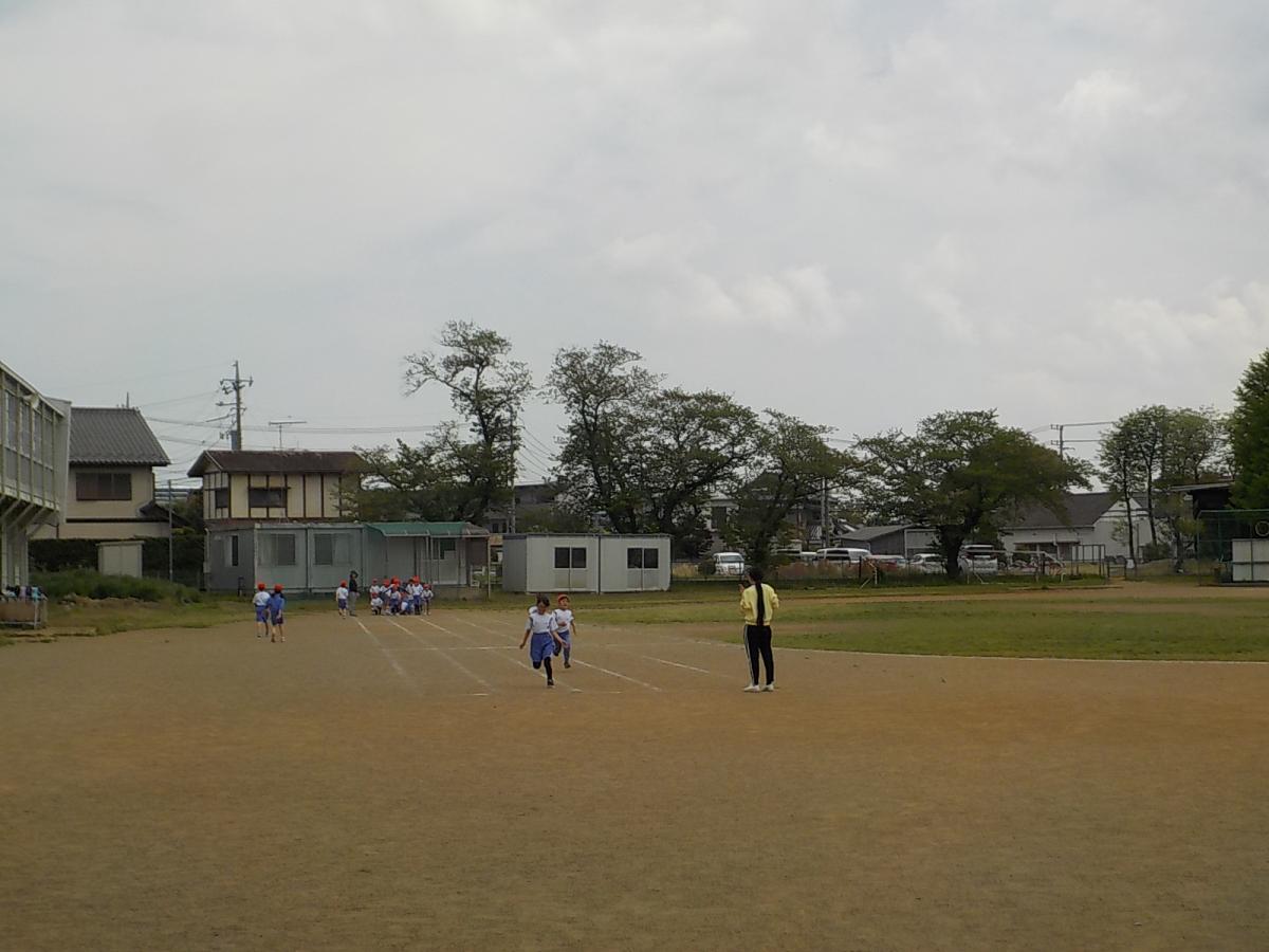 2年生の体育。この時期は、50m走です。今日は試しの練習です。