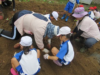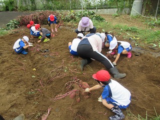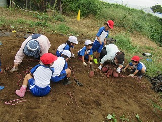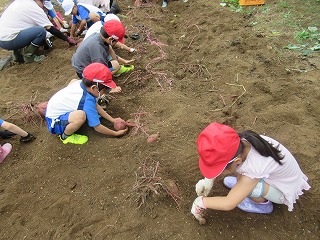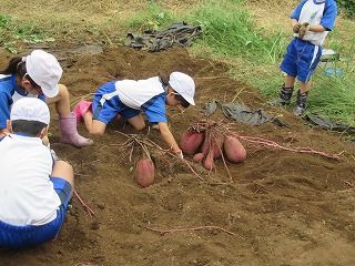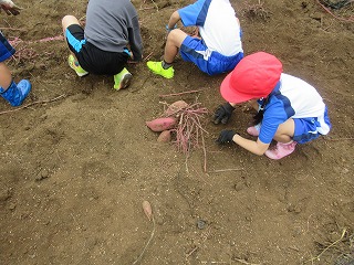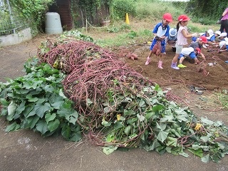 1年生は顔の大きさくらいの大きなお芋を収穫しました。友達と励まし合いながら、頑張って土を掘りました。家庭科室に並べてさらに甘くなるのをまっています。そして、ジャックと豆の木みたいな「さつまいものつる」もできあがり、そこから、クリスマスリースの形を作り、今乾燥させています。お芋を食べたり、リースを作ったりするのが楽しみですね。