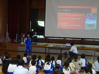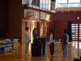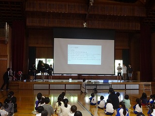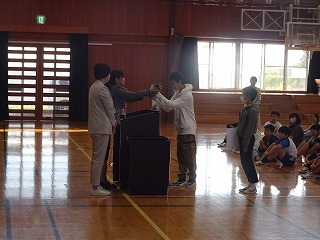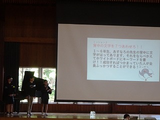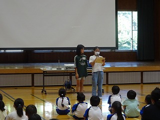 1校時に前期の終業式を行いました。表彰式のあと、3人の児童の振り返りの作文発表がありました。自分のことをよく見つめた素晴らしい振り返りでした。終業式のあとは、スペインにサッカー留学し、世界のレベルを感じてきた体験発表や柳橋小マスコットキャラクターの発表、全校遠足の「逃走中」のルール説明がありました。どの児童も自分の役割以上の相手を楽しませるという気持ちをもって、説明をしました。とてもよいお式でした。