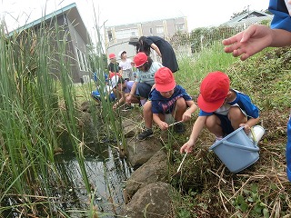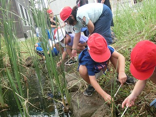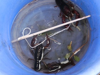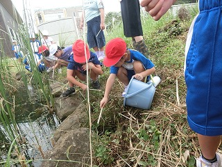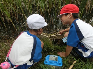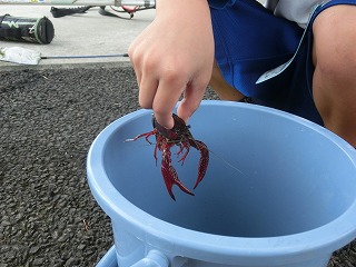 1・2年生は学校のビオトープで2回目のザリガニ釣りを行いました。前回よりも根気強く、上手のスルメイカの餌でザリガニのいそうな穴で、ザリガニを誘い出すことができました。「初めて釣れたよ。」と歓声をあげる様子や自然に協力する姿が見られました。今は、名前を付けて各クラスでお世話をしています。