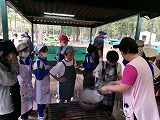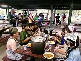写真は、カレーをみんなで作り上げ、達成感を感じながら食べている姿です。