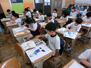 図工では、校外学習で大洗水族館に行った経験を思い出して絵を描いています。パソコンで大洗水族館のHPを見たり、魚の写真を探したりして下絵を描いていました。四つ切画用紙の本番では、クレヨンを使って色を塗り、綿棒やちり紙でクレヨンを伸ばすなど色を工夫している姿が見られました。今から完成が楽しみです。