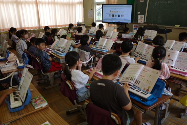 1年生教室から、かわいい歌声とピアニカの音色が聞こえてきました。先日のピアニカ教室で学んだことを生かして、どの児童も丁寧にピアニカを扱っていました。その後、歌パートと演奏パートに分かれての演奏です。それぞれ周囲の音をよく聞きながら、リズムを合わせて演奏し、歌声とピアニカの音の重なりを味わうことできました。