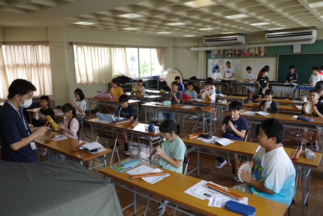 5年生が音楽で合奏に取り組んでいました。まずは個人で、そしてお互いにパートごとの練習に夢中になっていました。その後、全体で合わせてみます。演奏中は楽譜を覗き込みながら、自分のパートだけでなく、周囲の音にも耳を傾けながら、真剣にリズムを刻んでいます。演奏終了後、音楽室に「できた!」の声とたくさんの笑顔があふれていました。