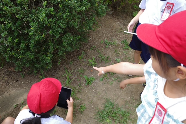 1年生と3年生が、校庭で虫探しに夢中になっていました。1年生は生活科で、3年生は理科でそれぞれ生き物に関する学習を進めています。どちらの学年の子供たちも蝶にバッタ、コオロギなど次々に発見し、タブレットに記録していきます。1年生が素通りしていた大きめの石、3年生は見逃しません。その石を裏返し、ダンゴムシを発見しました。「これは、足が6本より多いから、昆虫じゃないよね!」と互いに確認し合う姿に、学びの深まりを感じました。