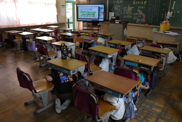夏休みが明け、学校に子供たちの元気な声が戻ってきました。防災の日でもある今日、夏休み明け集会に続いて、全校でのシェイクアウト訓練を実施しました。今回は、授業中に地震が起きたことを想定し、机の下に身を隠して頭を守る動きを実際に行いました。災害はいつどこで起こるかわかりません。繰り返し啓発しながら、意識を高めていきたいと思います。