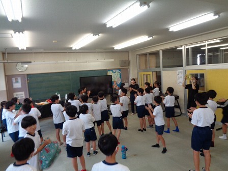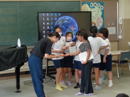 5時間目が終わると4年生全員が音楽室へ、そーっと移動しています。どうやら、担任の先生へのサプライズプレゼントを兼ねた学年レクリエーションを始めるようです!学年主任の先生に聞いたら、子どもたちが自分たちで企画して実行しているとのこと。各係がプレゼントの贈呈、クイズ大会、ショートコント、マジックなどのイベントを進め、笑顔があふれる楽しい会となっていました。