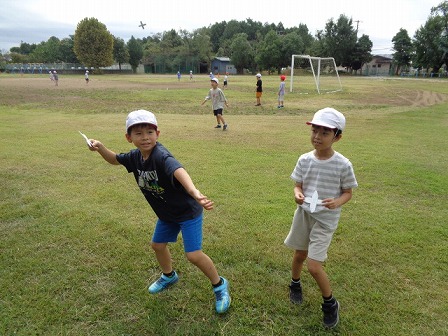 生活科で「うごくおもちゃ」を作っています。今日はブーメランを飛ばしてみました。思ったよりも高く飛んだブーメランに驚きの声や喜びの声が上がりました。「羽を折るとうまく飛んだよ!」など工夫したこと、試したことをお友達に教えている声もありました。たくさん舞う白いブーメランに飼育小屋で飼っている「おもち(烏骨鶏)」もびっくり(?)したのか、甲高い声を上げていました。