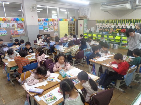 あいにくの天気ですが、1年生も元気に登校しました。朝は6年生が荷物の整理を手伝ってくれました。学級活動では先生のお話をよく聞いていました。お絵描きの時間は新しい友達との会話を楽しみながら取り組んでいました。順調に学校生活が始まりました。