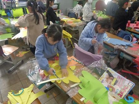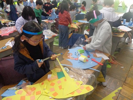図工の「つくってへんしん」ではへんしんしたいものを考えながら「へんしんグッズ」を思い思いに楽しみながら作っています。できたグッズを早速、身に付けながら、次のグッズを作っています。友達とも見せ合っています。子どもたちのアイディアは次から次に湧き出ているようです。