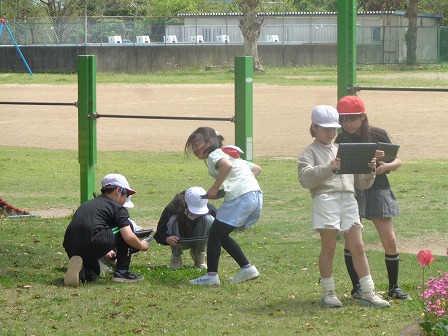 理科では季節によってあたたかさが変わると動物や植物のようすがどのように変わるか調べます。1年間の見通しを立てながら観察します。今日は校庭の春の様子を観察しました。少し画面が大きくなった新しいタブレット端末を早速使って次々と記録しています。いろいろな気付きに期待します。