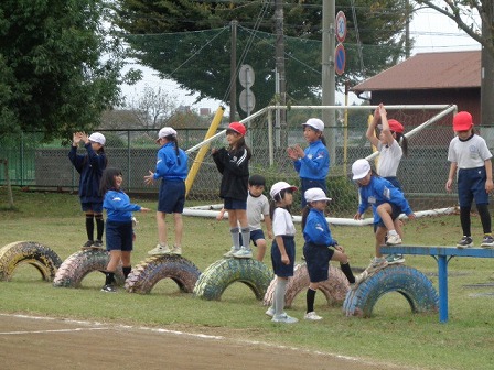 運動会もいよいよ近くなり、応援団の練習にも熱が入ります。休み時間ということもあり下級生の子どもたちもその様子を見入っています。一生懸命にがんばっている上級生の姿にあこがれ、やがては自分たちも同じ立場になり、九重小の伝統が引き継がれていきます。