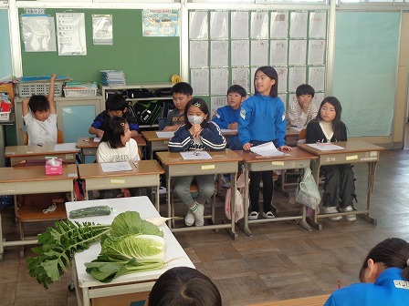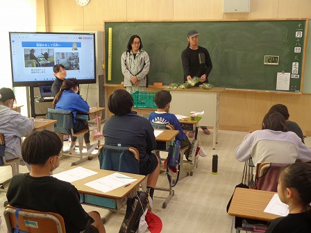 市内小学校の栄養教諭の先生と給食の食材を提供していただいている生産者の方をお招きして食育の授業を行いました。2年生、3年生、5年生で実施しました。大切な栄養のお話や、給食で使っている野菜について、実物を見せてもらいながら話を熱心に聞いていました。肥料のことなど質問もたくさんありました。