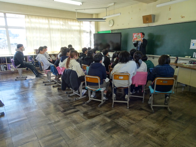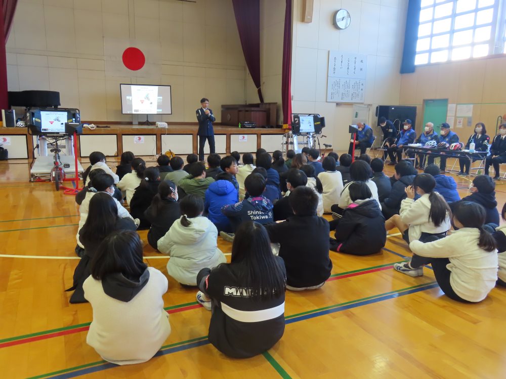 1時間は教室で警察官の方から交通安全に関する講話をいただき、もう1時間は自転車運転シミュレーターで交通事故防止のためのシミュレーションを行いました。