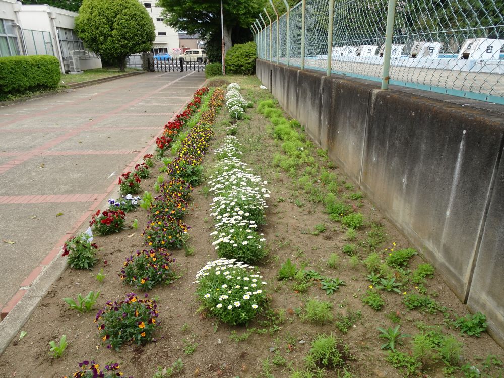 プール横にある花壇では。コキアもスノーポールもパンジー・ビオラもすくすくと育っています。